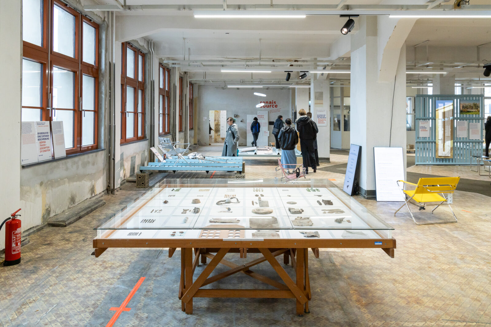 Die Ausstellung macht diese Geschichte sichtbar: Sogenannte Zeitfenster an Treppe, Fußboden, Pfeiler und Decke geben im Rahmen der Ausstellung den Blick auf die materielle Geschichte des Gebäudes frei. Was auf den ersten Blick unverändert wirkt, offenbart bei genauerer Betrachtung einen sensiblen Umgang mit der historischen Bausubstanz. Abgeblätterter Putz wird entfernt, Löcher werden geschlossen, was repariert werden kann, wird repariert oder umgestaltet – zum Beispiel alte Fenstergläser oder die Paneele der Hetaflex-Aluminium-Fassade, die im Zuge der Fassadensanierung im Frühjahr 2025 abgenommen wurden. Ergänzungen wie das Deckenleuchtsystem und Reparaturen des Bodenbelags aus den 1980er Jahren folgen den Prinzipien der Wiederverwertbarkeit.