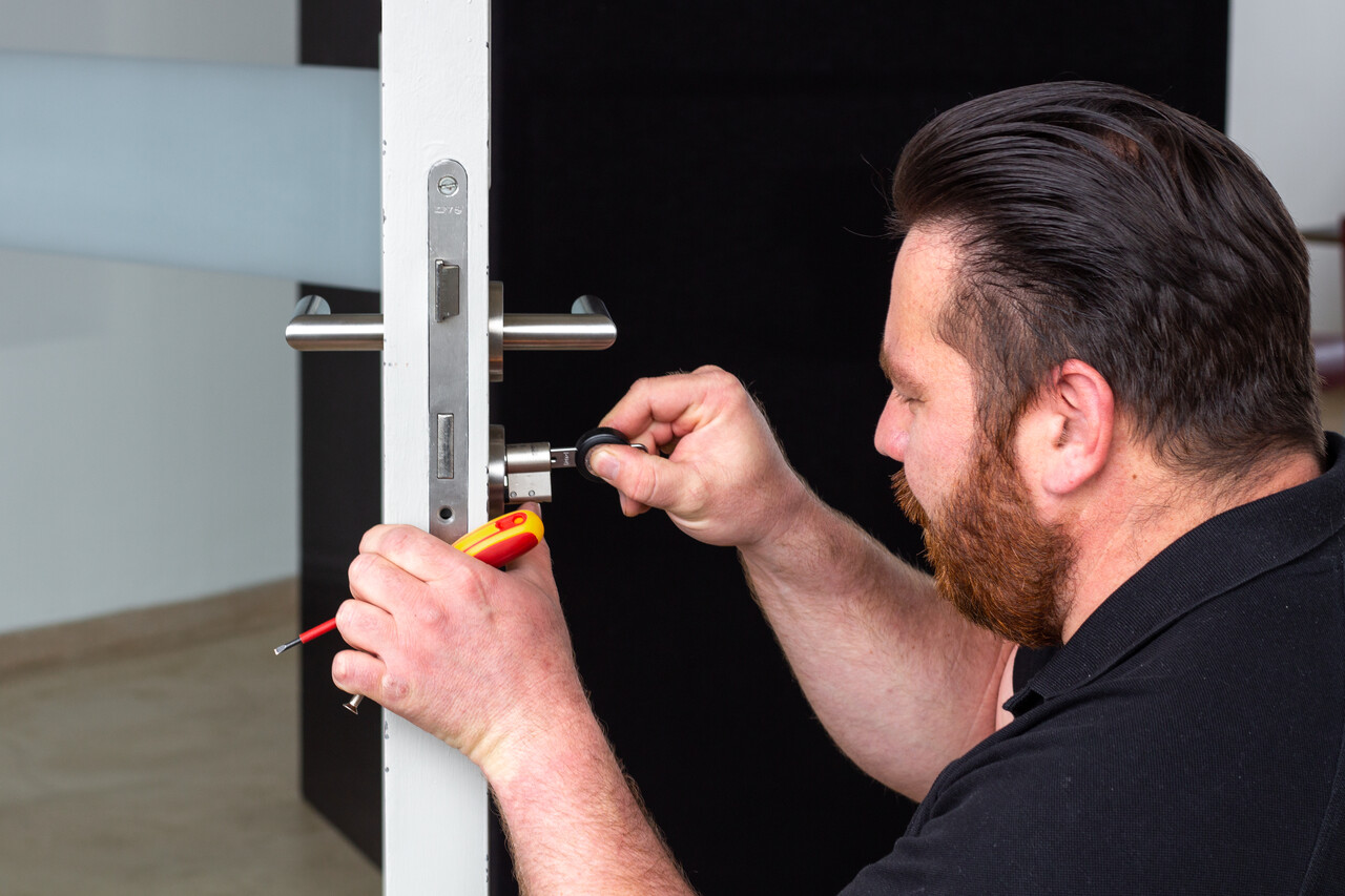 Auf einer grauen Tür mit Gropius Klinke ist ein Zettel geklebt. Auf dem Blatt Papier steht