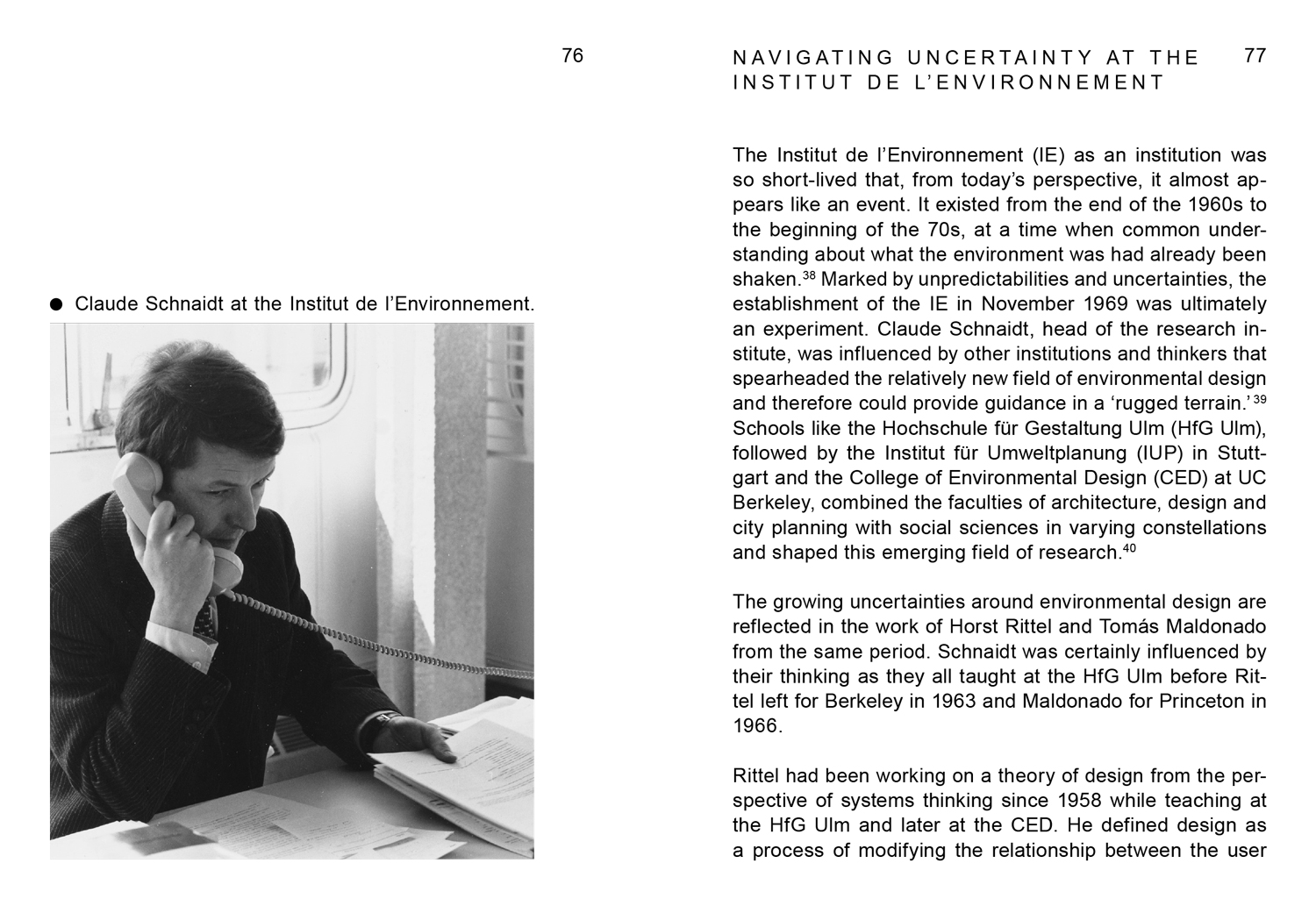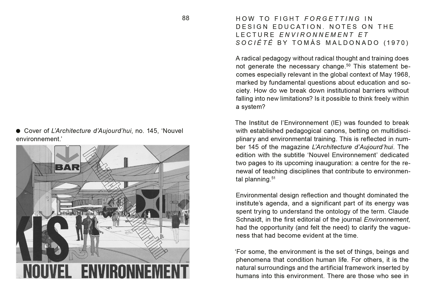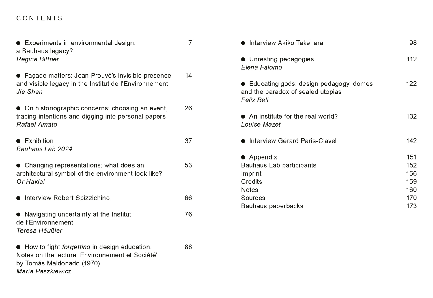 Das Institut de l’Environnement (1969–1971) war eine interdisziplinär ausgerichtete Schule in Paris. Gegründet im aufgeheizten Klima der globalen Studierendenproteste und des wachsenden Bewusst- seins für die Gefährdung der Umwelt, versuchte dieses Forschungs- und Ausbildungszentrum, die Lehrmethoden und die Rolle der Forschung in Architektur und Design neu zu definieren. Die Teilnehmer·innen des Bauhaus Lab 2024 haben sich mit den Lehr- und Forschungsaktivitäten des Instituts und dessen kulturellem Kontext beschäftigt. Entstanden ist eine Publikation, die die fragmentierte Geschichte des Institut de l’Environnement entlang der Frage „Was ist die Umwelt?“ betrachtet.